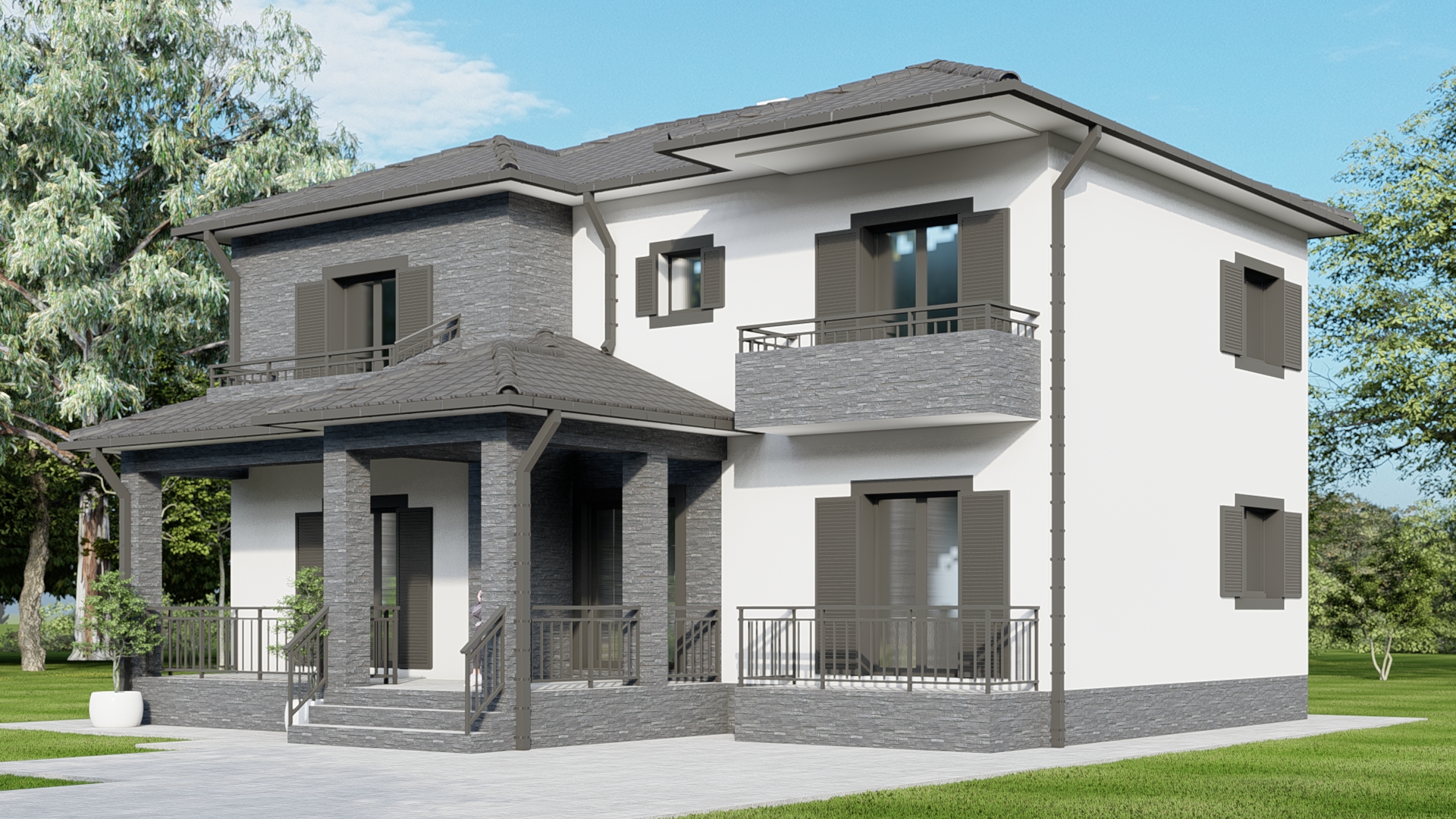 Detailed Preliminary Design: The complete project includes a detailed dimensioned base of the foundation, ground floor, first floor, roof, cross-section, 4 facades and a three-dimensional view of the house.