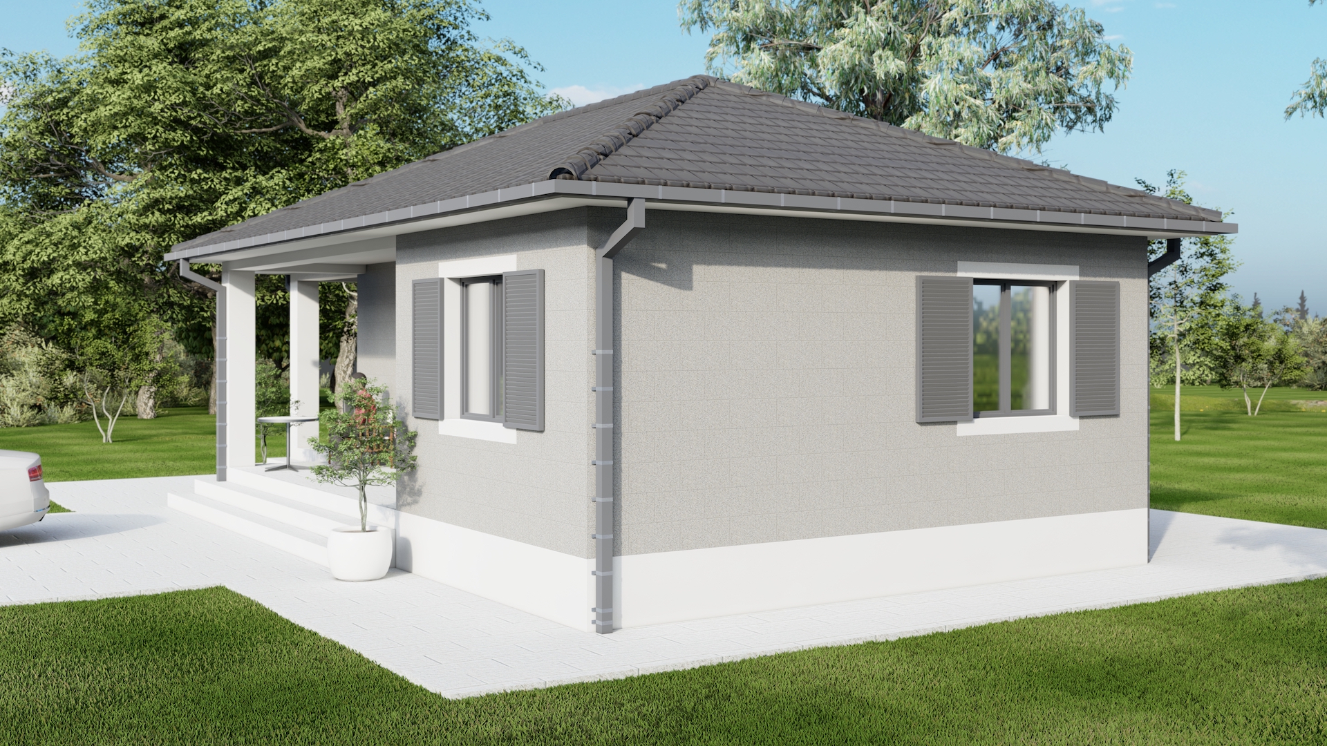 Kompletan projekat uključuje iskotiranu osnovu temelja, prizemlja, krova, presjek, 4 fasade i trodimenzionalni prikaz kuće.